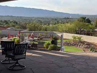 Winter or summer, rain or shine, the Main Patio is an absolutely wonderful area that quickly becomes the focal point of all your outdoor activities. Completely covered, it has two large patio sets that can seat up to 13 people, a two-person swing where the less-desirable family members can be exiled, and a water feature and plantings that soften the entire area. There are heating towers in winter and a misting system in summer to make your time outside even more enjoyable.